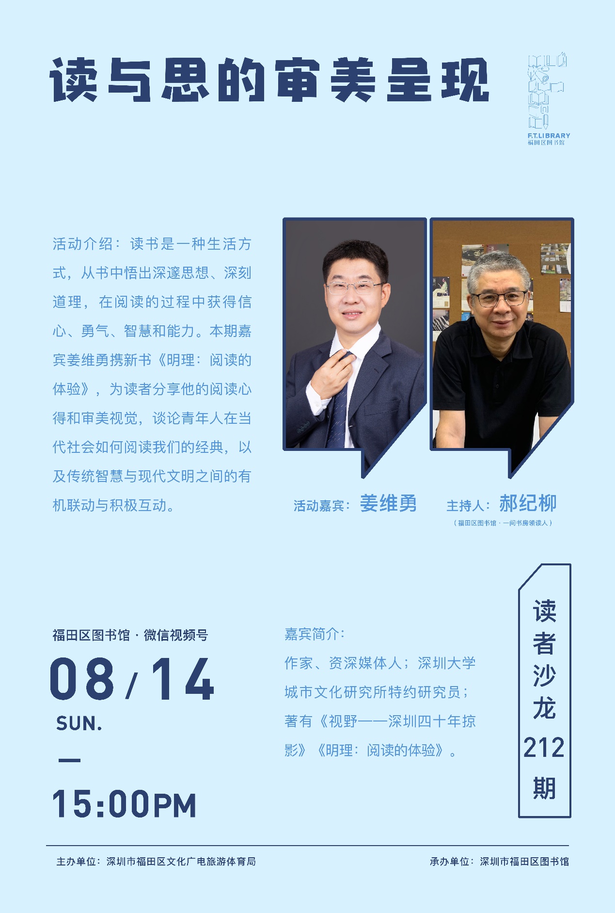 读书是一种生活方式,从书中悟出深邃思想、深刻道理,在阅读的过程中获得信心、勇气、智慧和能力。本期嘉宾姜维勇携新书《明理:阅读的体验》做客福田图书馆一间书房,对话文化学者、书评家郝纪柳老师,为读者分享他的阅读心得和审美视觉,谈论青年人在当代社会如何阅读我们的经典,以及传统智慧与现代文明之间的有机联动与积极互动。