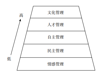 人本管理的着眼点在于满足人的合理需求。当代学者将人本管理划分为五个层次,即情感管理、民主管理、自主管理、人才管理和文化管理。(如下图所示)
