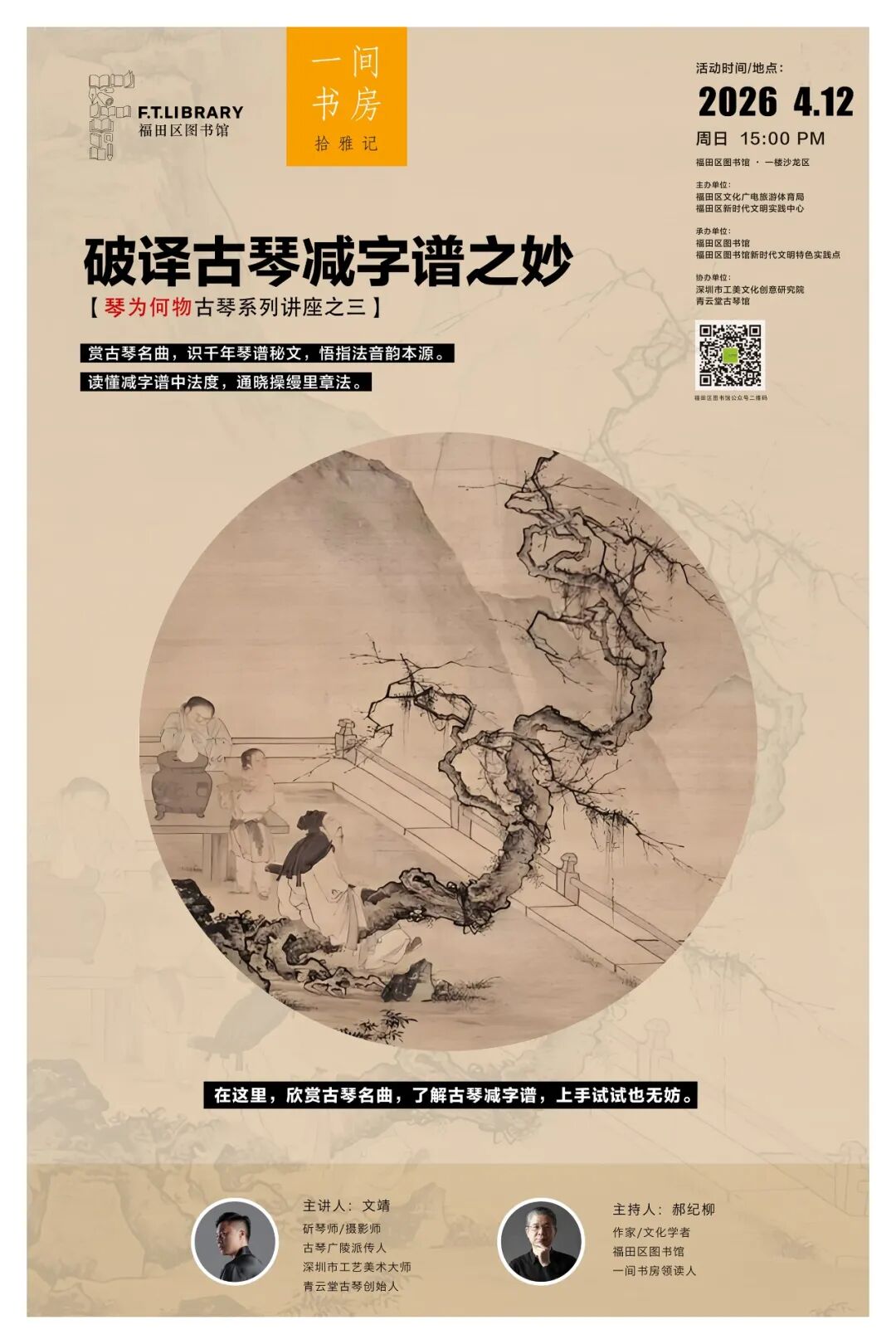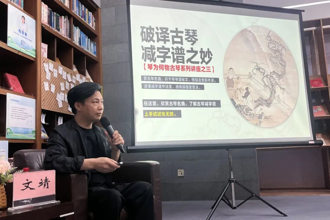 4月12日,一场极具传统文化韵味的古琴主题讲座在福田区图书馆圆满举办。本次讲座由文靖主讲、郝纪柳主持,带领现场读者走进古琴记谱的千年历史,深度解读文字谱与减字谱的精妙,感受传统古琴文化的当代魅力。