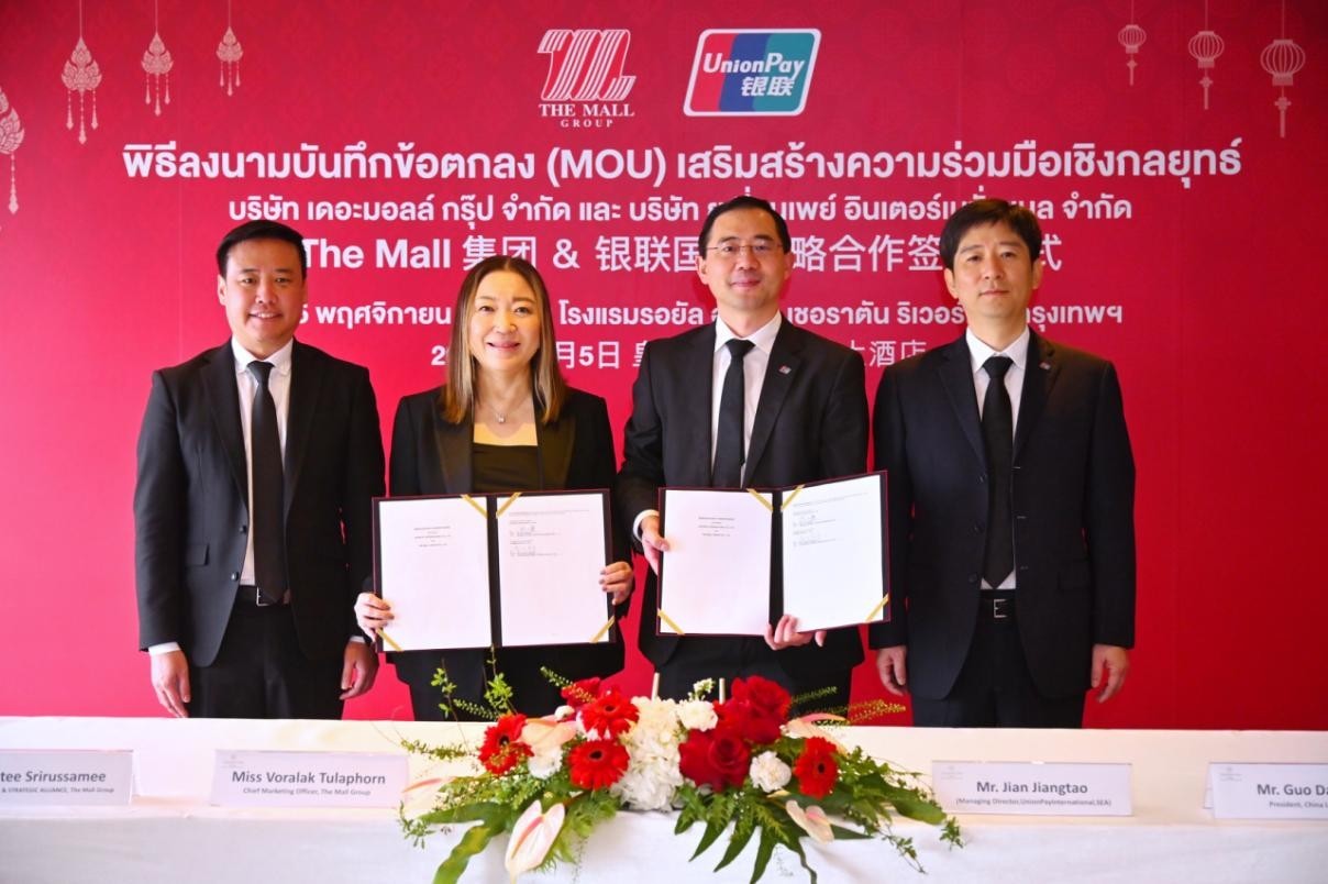 11月5日,银联国际与泰国著名商业中心运营商The Mall集团签署战略合作备忘录,约定在优化受理体验、品牌营销推广、数据分析共享等方面开展深度合作。中国银联总裁郭大勇、银联国际副董事长谢群松、The Mall集团首席营销官Voralak Tulaphorn出席签约仪式,见证双方合作迈入新阶段。
