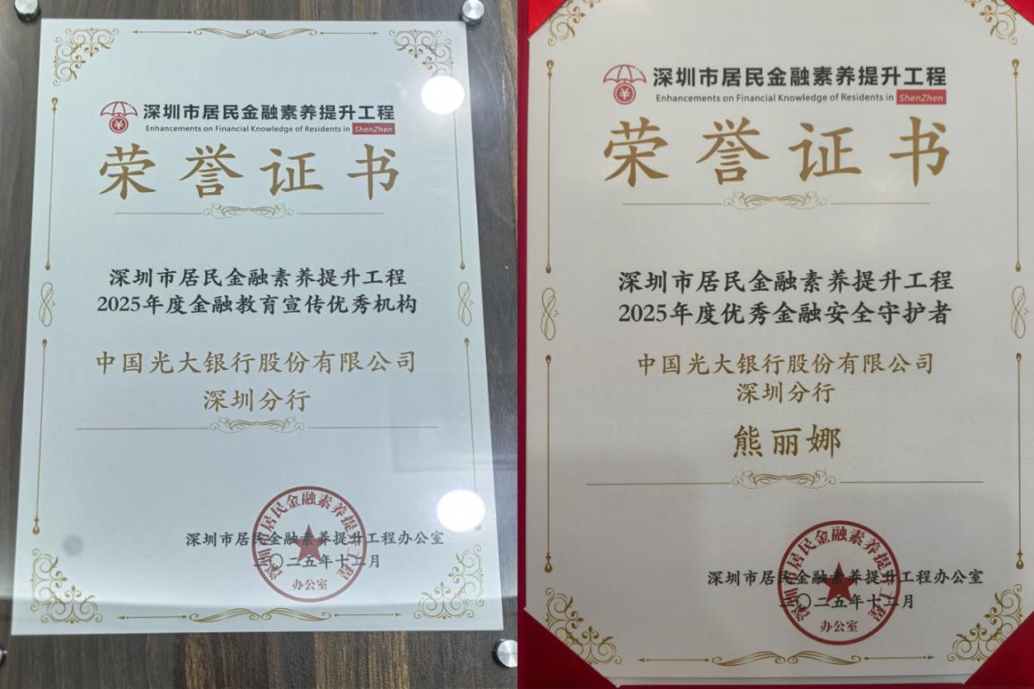 活动当日,同步举办深圳市居民金融素养提升工程2025年度总结会。对在工程宣传工作中表现突出的团体和个人等进行了表彰。中国光大银行深圳分行荣获由深圳市居民金融素养提升工程颁发的“2025年度金融教育宣传优秀机构”、深圳景田支行熊丽娜荣获“2025年度优秀金融安全守护者”。