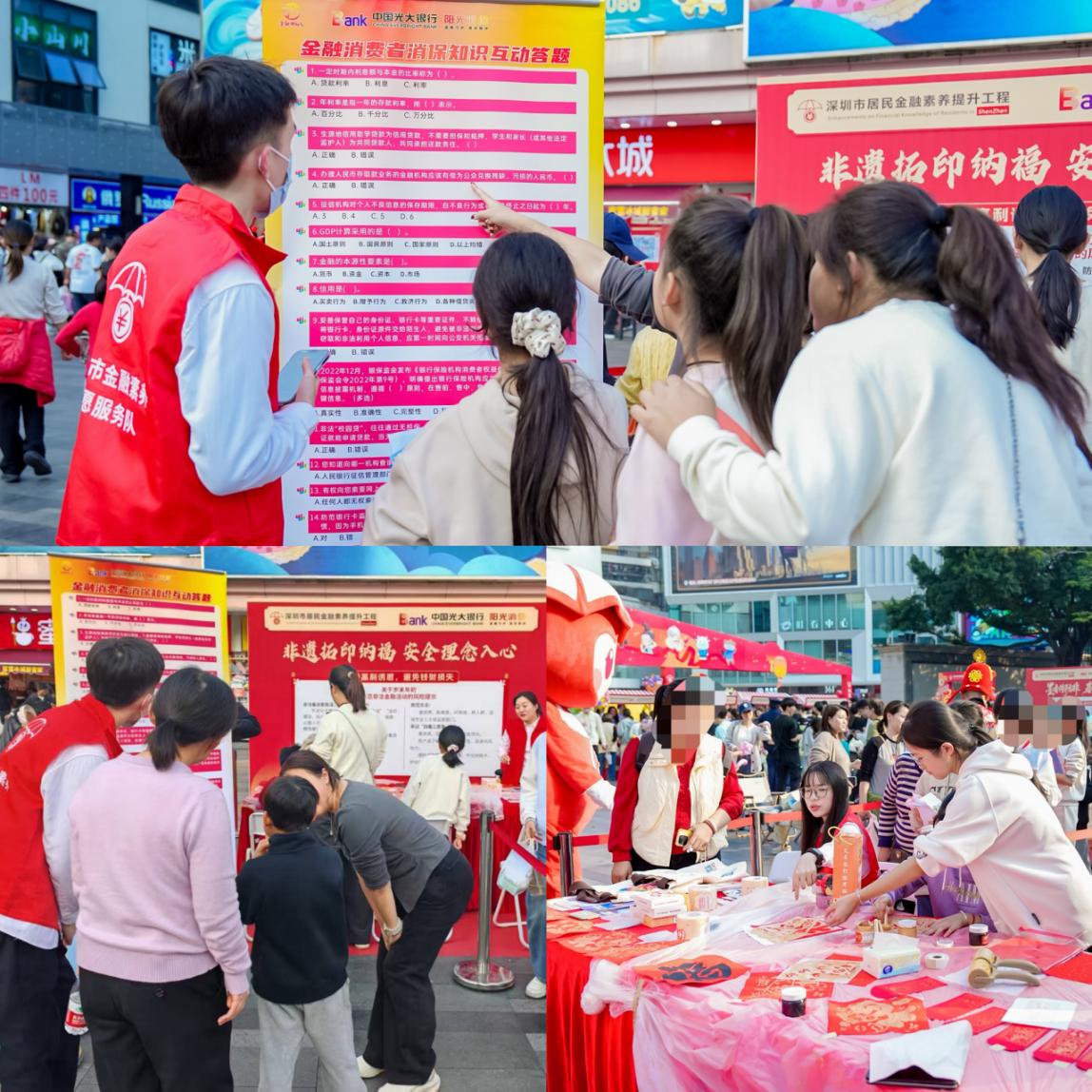 本次活动中,中国光大银行深圳分行将非遗技艺与金融教育进行创新融合,推出“非遗+消保”的宣传形式。市民通过参与金融知识答题学习,即可体验非遗拓印技艺。在参与答题的过程中,深化对防范非法集资、识别金融陷阱的理解。有效引导不同年龄段的市民,聚焦银发群体与青少年,在金融答题中中掌握金融安全知识,增强了金融教育的覆盖面与渗透力。