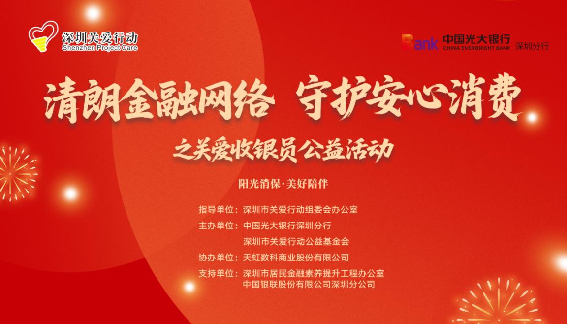 本次活动由深圳市关爱行动组委会办公室、深圳市关爱行动公益基金会、中国光大银行深圳分行、中国银联深圳分公司、市居民金融素养提升工程办公室及天虹商场等单位联合主办。活动以“清朗金融网络 守护安心消费”为主题,圆满举行了开幕式暨关爱收银员公益活动。