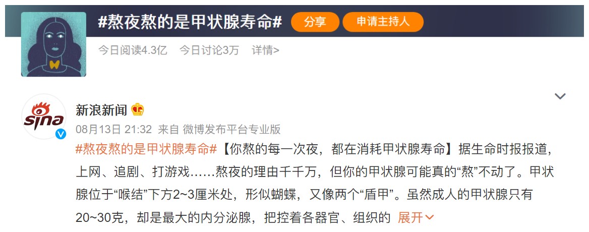 近日,#熬夜熬的是甲状腺寿命#的话题冲上热搜,引爆人们关于熬夜,关于甲状腺疾病的思考与讨论。