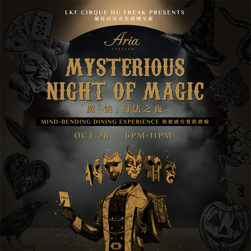 ●ARIA魔“诡”幻法之夜:从晚上6时开始,客人可无限畅饮意大利气泡酒及红白葡萄酒,并于晚上7:30开始品尝美味大餐。魔术师Zenneth将登台展开令人眼花缭乱的表演,以精湛的特技近景魔术,为你带来一个颠覆感官的万圣节之夜。