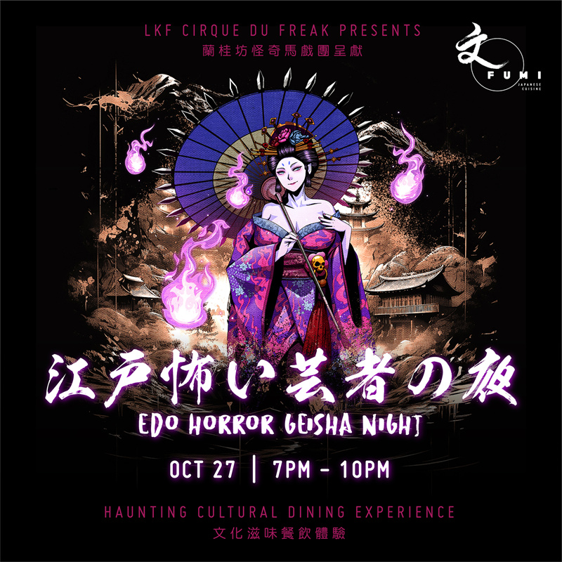 ●FUMI江户怖い艺者の夜:令人目不暇给的诡魅艺伎表演,一场迷人的演出将在你眼前展开。在享用万圣节晚餐途中,艺伎舞蹈独领风骚,让你体验和式文化的迷人之魅。