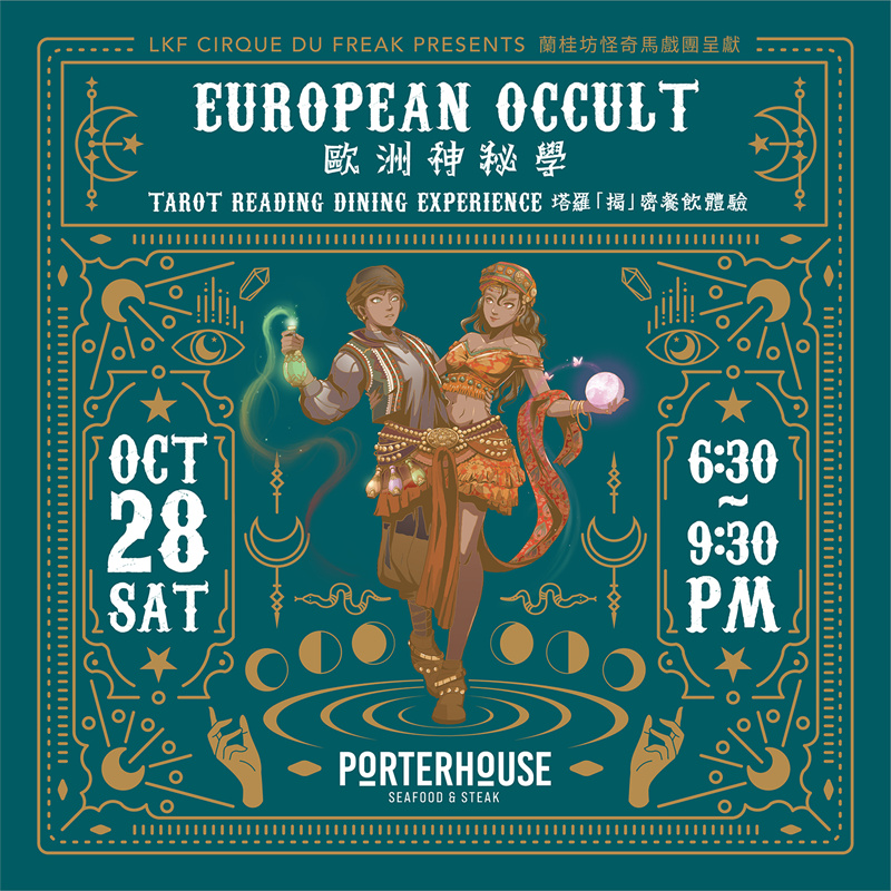 ●Porterhouse欧洲神秘学 — 塔罗揭密体验:由晚上6时半开始踏上神秘之旅,透过欧洲”塔罗占卜”和餐饮体验,去认识你的命运。客人可以品尝到Porterhouse屡获殊荣的”海陆风味”万圣节套餐,亦可选择自由畅饮,在微醺下一同探索欧洲神秘学的玄妙。