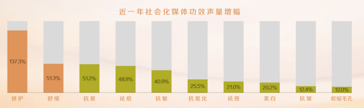 根据《中国功效型护肤行业2022发展趋势报告》数据统计:2021年社会化煤体护肤功效声量增幅中,修护和舒缓的声量增长分别达到137.3%和51.3%,位列第二,说明需要舒缓修护的敏感问题性肌肤成为关注主流。
