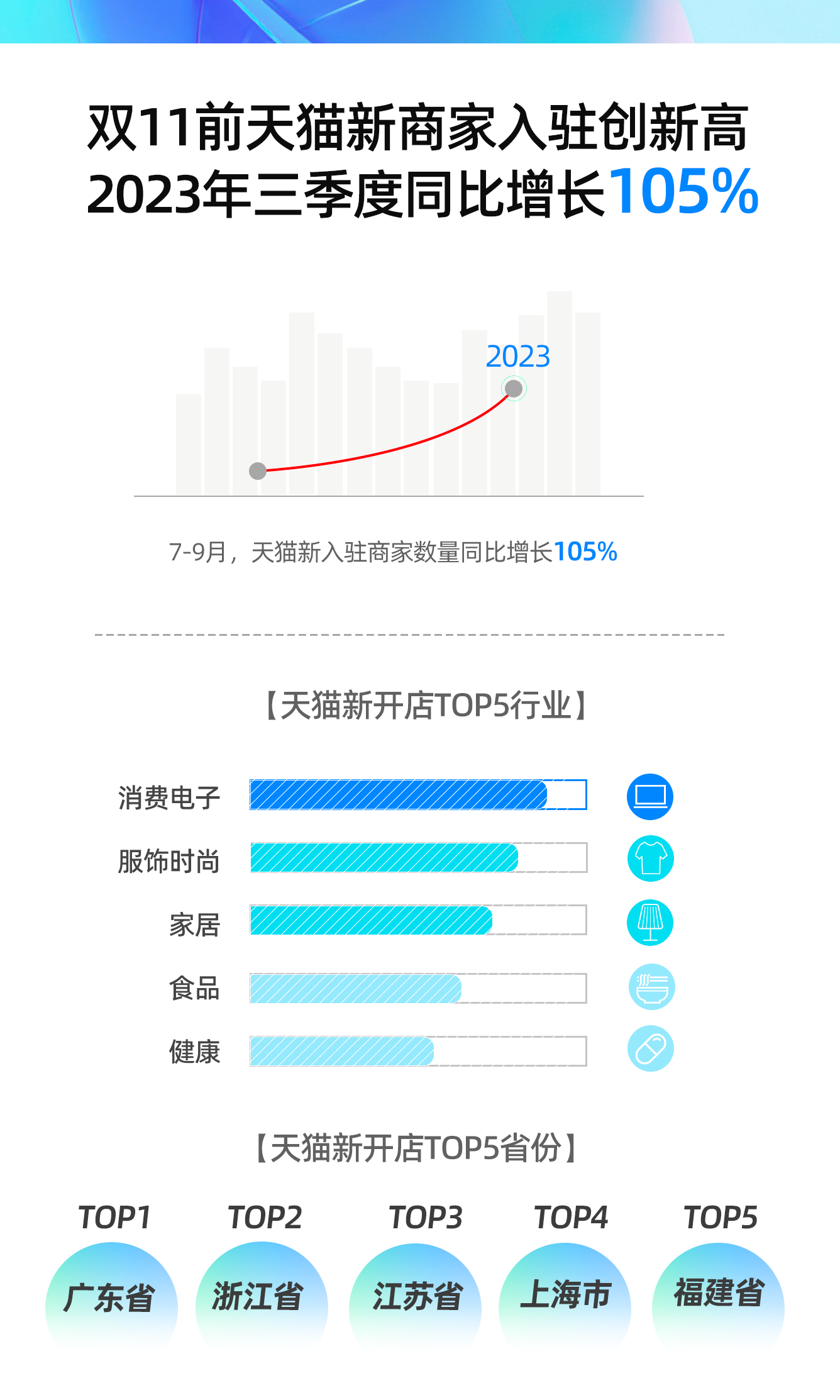 分类型来看,这批新入驻天猫的品牌中,42%是中国制造产业带工厂创立自有品牌,18%为满足市场新需求应运而生的新消费品牌。同时,直播红人、内容型IP也是此轮创牌热门类型。分地域来看,来天猫开店创立品牌数量最的TOP5省份为,广东、浙江、江苏、上海、福建。
