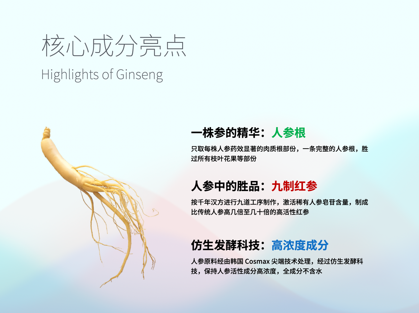 这款产品的配方以“百草之王”人参为核心,每株人参只取功效显著的人参根部份,按传统汉方进行九道工序制作,激活人参皂苷的含量,制成高活性的九制红参,具有出色的活化细胞修复功能。