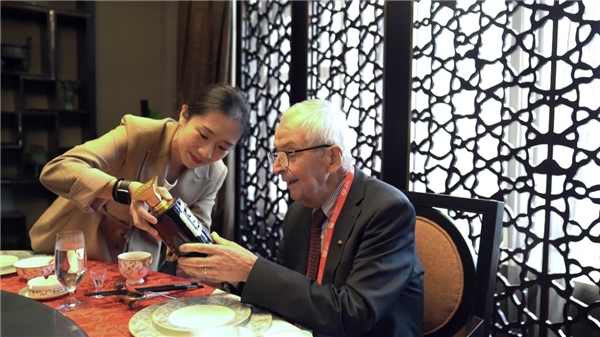 托普弗博士本仅想浅尝高度酒,但在亲自品鉴之后,为国馆老酒的美妙体验而倾倒,主动频频举杯,恰逢天气转凉,他表示品饮数杯之后,不仅酒香更加浓郁,入口愈发丝滑,周身也感到温暖舒适起来。