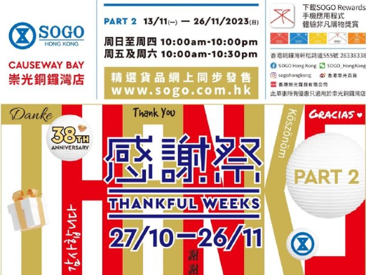 2023年下半年「崇光百货SOGO」感谢祭正式启动,从10月27日至11月26日为期一个月时间。各个大牌潮牌优惠和折扣力度很大,打折力度可媲美内地的双11,Fresh指定面膜买一送一、Armani粉底套装4折、Adidas鞋子两双399元、Furla包包更是低至1900元!
