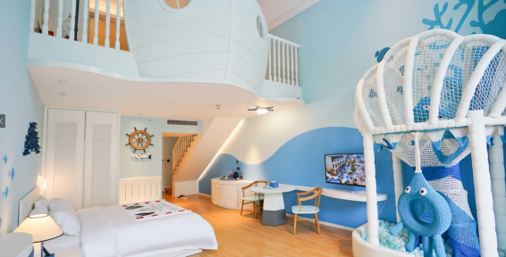 森林海作为亲子房的引领者,不仅有各种不同主题房型,更是在房间内设置了游乐设施。海洋、星空、森林三大亲子主题房为游客带来别具一格的住宿体验;仿佛进入“宫崎骏”童话世界的树屋城堡,又分为森林城堡、花朵城堡、童话城堡等主题房型,每套都配有观景台,可远眺美丽风景,部分房型还有旋转木马、滑梯和树洞基地,为孩子们打造了一个童话般的天地。