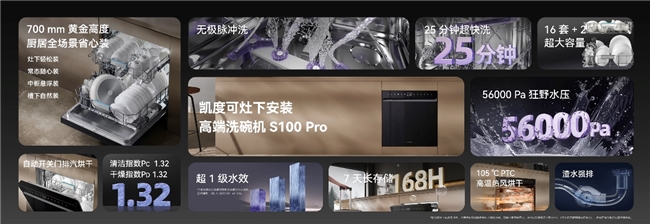 与此同时凯度还发布了一款号称“灶下新物种”的S100 Pro洗碗机,也是发力空间设计,针对灶下空间普遍较为局促的痛点做到了700mm的黄金高度,与普通中式橱柜完美契合,在这种体型条件下不但没有减配,反而全面增配看齐G200,做到了同级别56000Pa的无极脉冲洗技术,更开创性支持自动开关门烘干和渣水强排功能,清洁和干燥指数双双高至1.32,把灶下洗碗机的清洁烘干效果推向一个新高度。
