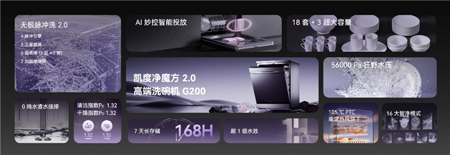 针对行业洗碗后最后一公里的清洁难题,凯度推出了G200超高端洗碗机,其全新自研的强力深净 0 残水渣水强排技术,有效解决了存储异味、细菌滋生、梅雨天返潮等问题;创新搭载的“AI妙控智能投放”可自动计算洗涤剂用量,一次投放管两周,既省心又省耗材。更值得一提的是,拥有18套大容量的G200,占地面积却和16套洗碗机相近,据悉这是凯度充分调研和考量中式厨房大小后选择的黄金尺寸,为大容量洗碗机轻松走进万千家庭带来了全新可能。