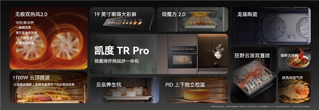 最引人注目的,首先是凯度TR Pro嵌入式微蒸烤一体机,其首创的“云顶微魔方2.0”,能实现微波、蒸、烤、炸、炖、炒、焗七合一功能,能组合出上万种烹饪可能,通过AI心动曲线算法精准调控火候、温度、湿度,甚至10分钟就能复刻米其林牛排;再搭配上19英寸画境彩屏交互、1100W云顶微波,DIY三段组合烹饪、变频水波烹饪等诸多能力上的革新和提升,带来更加极致的厨居美学和烹饪体验。
