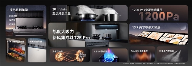 凯度2020年就已进入集成灶赛道,经过多年技术累积,此次发布的T2E Pro也是一款性能满级的集大成者,不仅外形美观时尚,而且各项数据硬参数也令人惊喜。如油烟机模块,其28m³/min大吸力+1200 Pa超级巡航静压,真正不跑烟、防倒灌,噪声低至 50 dB,全域降噪,能静谧的如同图书馆一般;灶具模块,5.2kW聚能猛焰+68%热效率,不仅完全满足中式家庭对大火爆炒的需求,还节能经济;蒸烤一体机模块,无极双热风技术、双直喷蒸汽、92L超大容量、陶瓷内胆等等一应俱全,重新定义集成灶性能天花板。