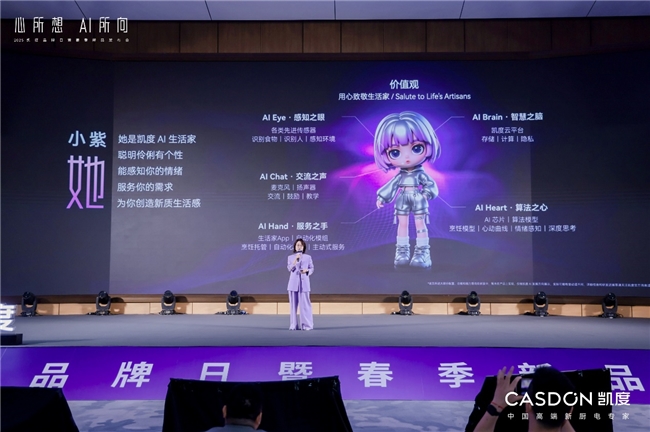 发布会高潮是凯度首个AI数字生命体“小紫”的亮相。“小紫”规划中整合了五大核心模块,包括:AI Brain智慧之脑、AI Heart算法之心、AI Eye感知之眼、AI Chat交流之声、AI Hand服务之手,其未来不仅可预判用户需求,更能感知烹饪情绪,成为“能读懂妈妈藏在火候里的牵挂”。 在柯漫的设想中,这一切,将彻底改变我们的生活方式,也是凯度所希望创造的新质生活感,“小紫”也不是一个冷冰冰的“工具”,而是“活在厨电里的“家人”,每一位生活家用户都值得被如此用心对待。