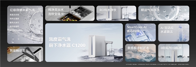 而霸气洗净水器C1200,是一款支持亿级微纳米气泡洗的创新厨下净水器,既能通过微纳米气泡水去除果蔬农残肉类激素,又可实现“小气泡净颜焕肤”,全维度提升净洗洁净力;对于净饮需求,C1200还搭载了长效RO滤芯+矿化技术,可瞬出更健康沁爽的矿泉感直饮好水,满足生活全场景饮用水需求。此外,其首创性搭载SmartCore-AI省芯科技,智能预测滤芯寿命,另一方面通过AI智适应水滤算法,基于不同水质调控水滤模式和废水比,多维度节省滤芯消耗,能帮用户大幅减少耗材成本。