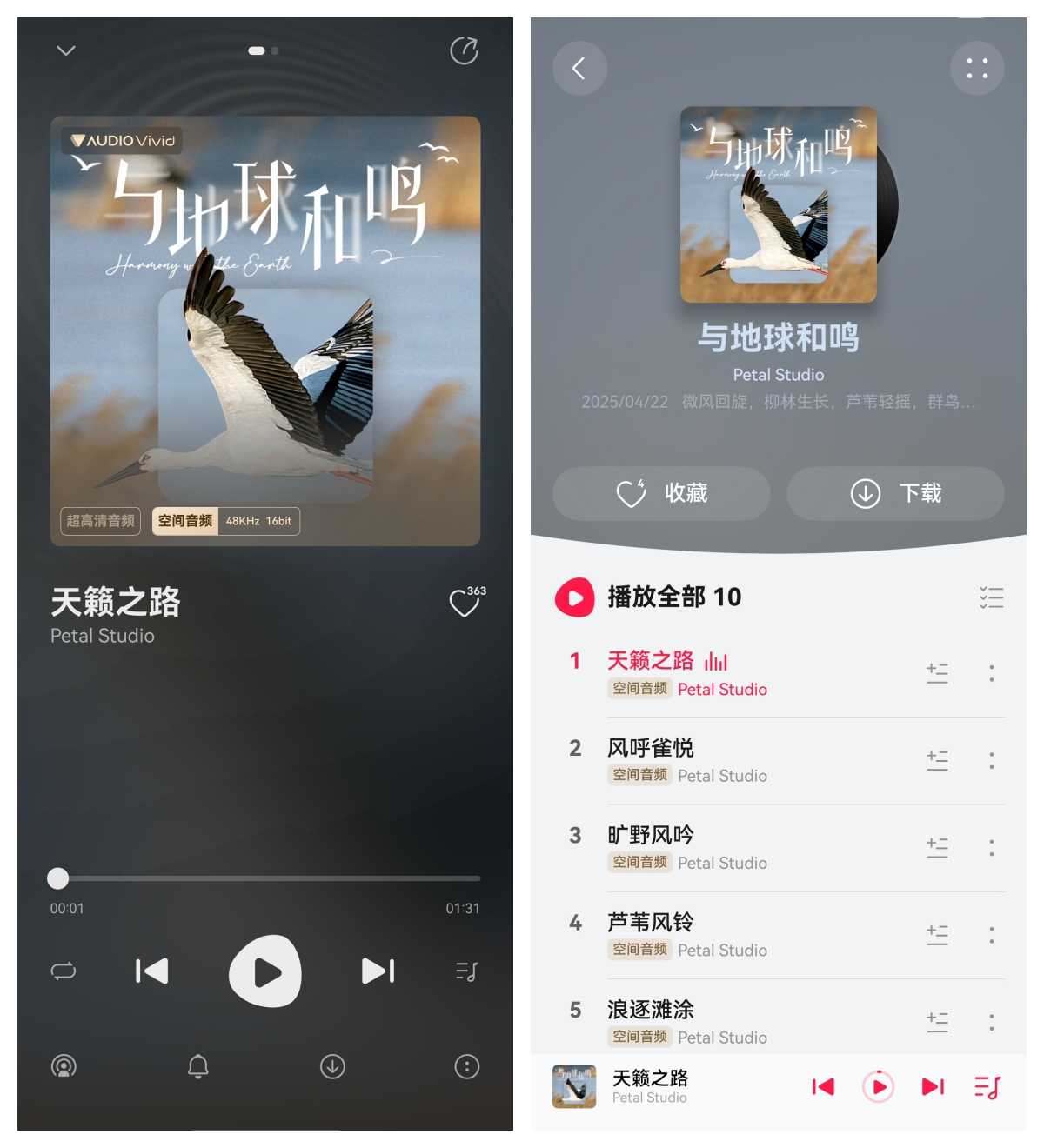 同时, HarmonyOS 5之下的华为音乐还实现了每一首歌都是“超高清音频”。自然的声音可以更高解析度呈现:水流的潺潺声带着细微波纹质感,飞鸟振翅声中隐约可见羽毛震颤,通过露珠下坠声仿佛能看到水波泛起的银白涟漪倒映着朝阳升起。这种超高清的“声临其境”体验,让环保不再只是抽象概念,而是可感知的生命律动。风声、水声、涛声、鸟鸣……无论是清晨的潮起潮落,还是黄昏时群鸟归巢的喧闹,任意一首都是超高清品质,每个音符都充满生命力。