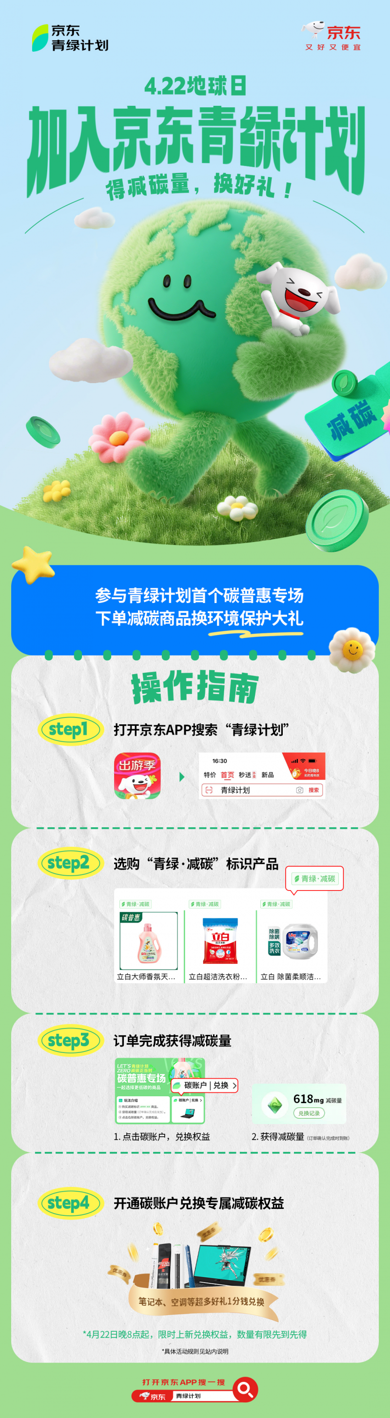 今年4月22日是第56个世界地球日,京东通过“青绿计划”开启首个碳普惠专场活动,联合立白、晨光、雀巢咖啡、华硕、美的、罗技等品牌带来高质量的减碳商品和购物福利,将消费者的每一次绿色订单转化为守护地球能源的关键力量。