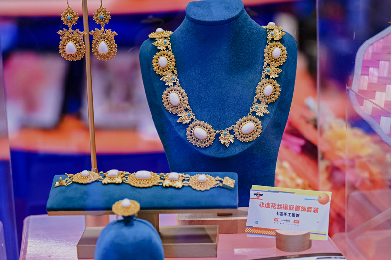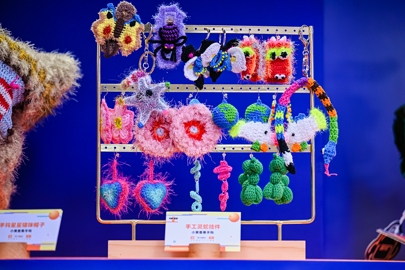 在文博会的淘宝展区,银花丝首饰、缉珠正凤发钗、苏绣双面绣等创意商品让人挪不开眼。来自广东潮州的“小黄香蕉”原创手钩淘宝店,在传统手钩中加入新潮设计,让手钩工艺以一种全新的姿态出现在年轻人的视野中。来自广西桂林的商家“芽小七手创”主理人刘思蔚说:“我们把醒狮和棒球帽结合,虎头包加上现代元素,没想到00后们抢着买单!”此外在现场还有非遗银花丝、高黎贡手工造纸、竹编等上百件非遗周边商品,让参观者直呼“非遗还能这么玩”。