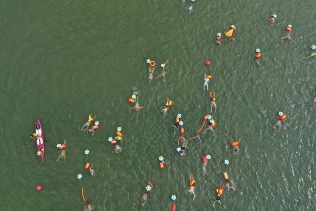 活动现场气氛热烈,从凤城广场到江滨公园(渔女像)之间的江面变成了一片欢乐的海洋。北江江面上,选手们奋勇向前,他们矫健的身姿成为江面上一道亮丽的风景线,可爱的清远鸡文创“小清”也在水面上欢快地“游动”着,岸边的彩旗飘扬,像是在为横渡人员加油助威,两个“队列”鲜艳的色彩铺满了整个江面,引人注目。