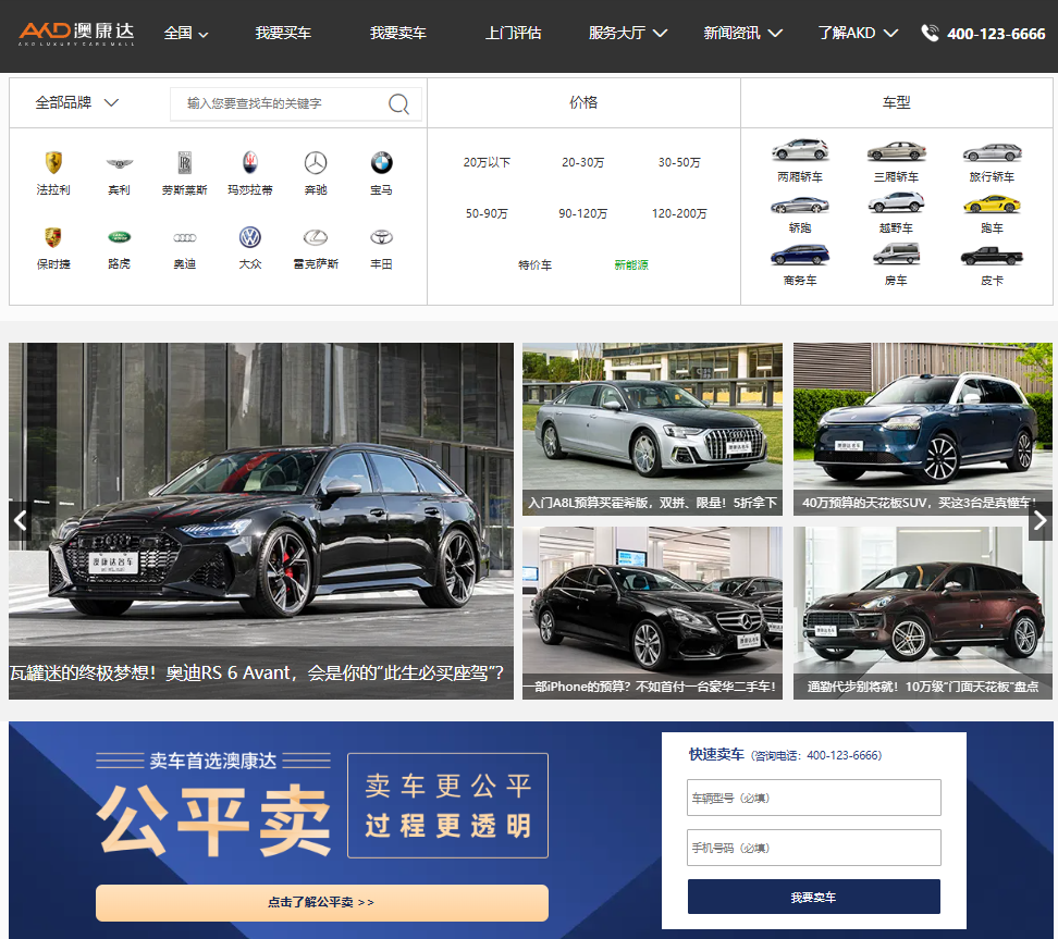澳康达主打的是中高端品牌,价位普遍在20万以上,也有不少百万级以上的豪车。其中保时捷、奔驰、宝马是他们销量最高的三个品牌。
