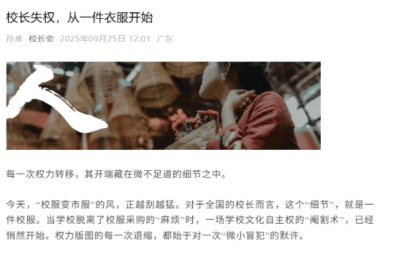 近日,“校长会”发布长文《校长失权 从一件衣服开始》,质疑部分省市推行的“全市统一校服” 政策架空学校教育自主性,引发教育体系与社会公众的广泛热议。这场看似以反腐降价为目标的变革,实则牵动着教育自主权、校园文化认同、市场发展规律及亿万家庭利益,背后是复杂的权力转移,值得深入审视。
