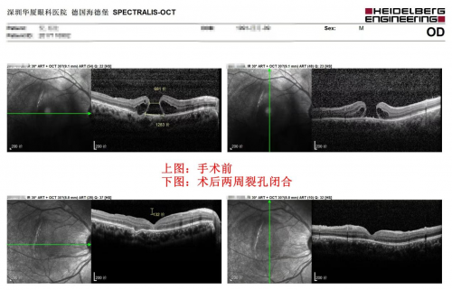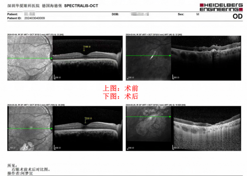 出院后患者自觉视力恢复不明显,遂至华厦眼科医院赵铁英院长门诊求治,此时伤后两个多月眼底积血部分吸收及下沉,可见明显的外伤性黄斑裂孔、及右眼视网膜脉络膜挫伤瘢痕,视力已下降到 0.25,虽然黄斑裂孔的直径仅600多微米,但已是这类疾病中的比较大的裂孔了,而且对视力影响巨大!这对自90年代末在广州中山眼科中心攻读博士期间就开始研究黄斑裂孔治疗的赵铁英院长来说治疗方案还是非常明确的,早在2015年她就在《中华眼科杂志》上发表过一篇有关外伤性黄斑裂孔治疗的文章。
