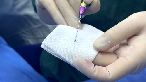 赵铁英院长仔细询问致伤过程,查看此前两家医院的检查报告,还是怀疑异物有铜丝的可能性,以往接诊过铜异物长期在眼内产生化学毒性反应致盲的病例,所以又与特检科何梦宜主任在光学相干断层扫描仪下动态观察异物精确位置和堪入的组织深度。在跟患者充分交代沟通、做好各方面准备后还是决定进行取出手术,以防局部组织包裹粘连。在Alcon3D显微镜下精准微创顺利取出的异物,确定为铜丝。