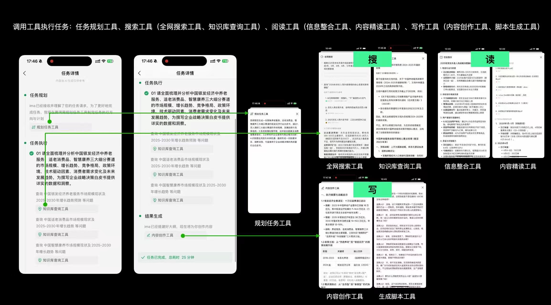 用户开启“任务模式”后,ima将基于全网或知识库数据,通过LLM自主拆解、规划任务步骤,并调用精读内容、全网搜索、知识库查询、内容创作等工具完成用户输入的指令,并在执行过程中自我监测与修正,最终产出可直接使用的结果。如输入“帮我写一份新能源汽车市场报告”、“整理会议讨论的要点并生成纪要”、“为我设计一节‘生成式 AI’教学播客”,拥有agent能力的“任务模式”,将深度学习和理解自然语言里的“藏”的任务,拆解规划成一个个工作节点,深度利用全网信息的“全”和知识库资料的“精”,将搜读写的工作流一体化。