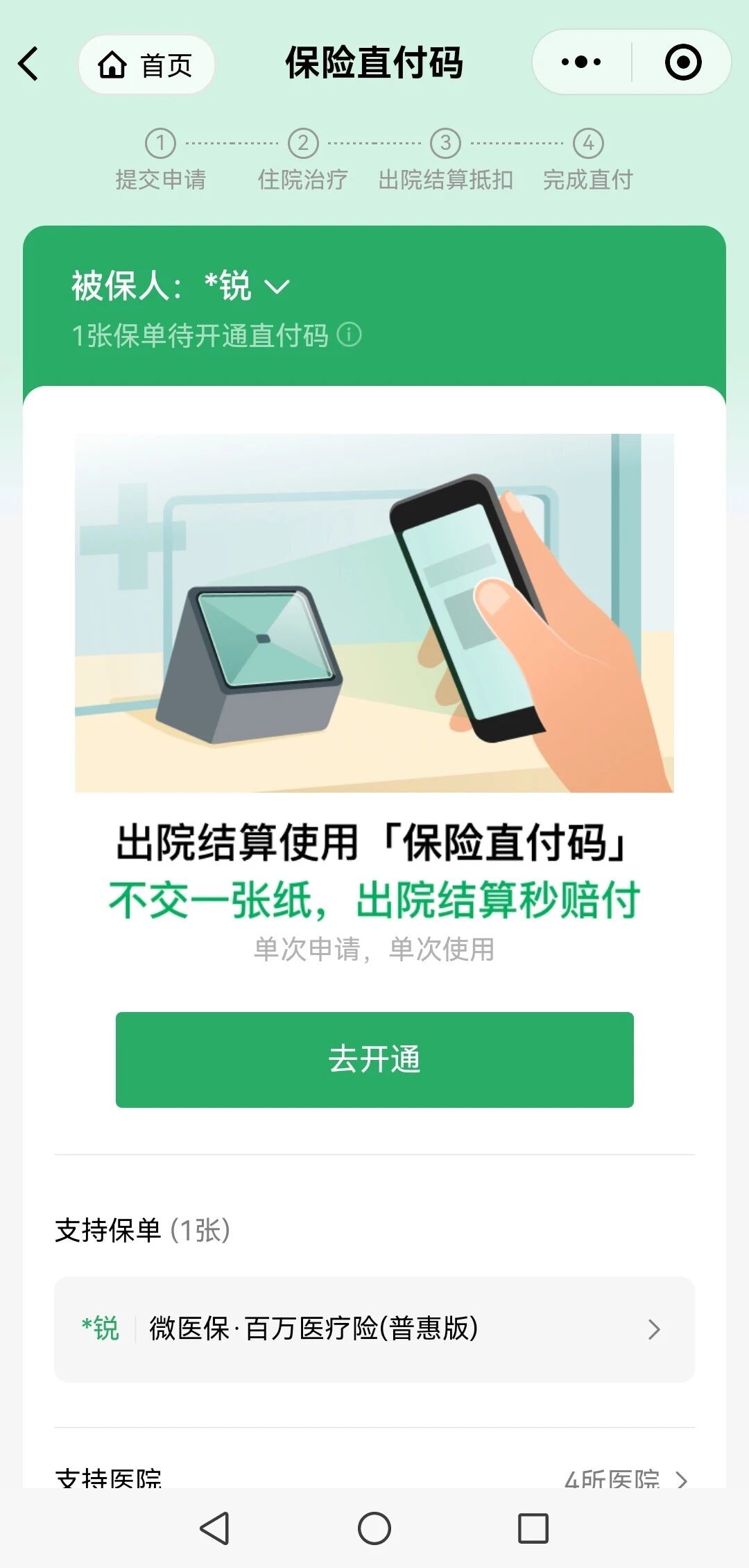 在腾讯微保平台拥有微医保·百万医疗险(普惠版)在保保单的用户若在以上医院接受住院治疗,出院结算时即可享受门诊及住院医疗费用的“商保+医保”一站式结算。具体而言,当用户使用微信支付完成入院押金支付时,微信支付会通过消息提醒用户可授权使用直付服务;出院时,微信支付提供了直付服务必需的直付二维码(用户首次使用“商保直付”服务,需要在微信支付授权开通此功能),用户可使用直付码在医院内窗口或自助机进行付款。使用直付码时,系统将向用户展示商保赔付情况,若医保和商保报销后用户还需要支付剩余款项,也可以使用微信支付完成自付。使用直付码后,腾讯微保也会展示本次整体支付明细账单,方便用户随时查阅。