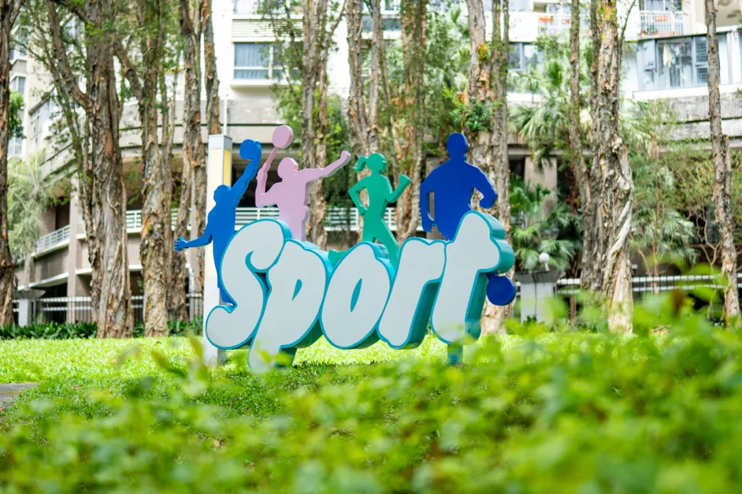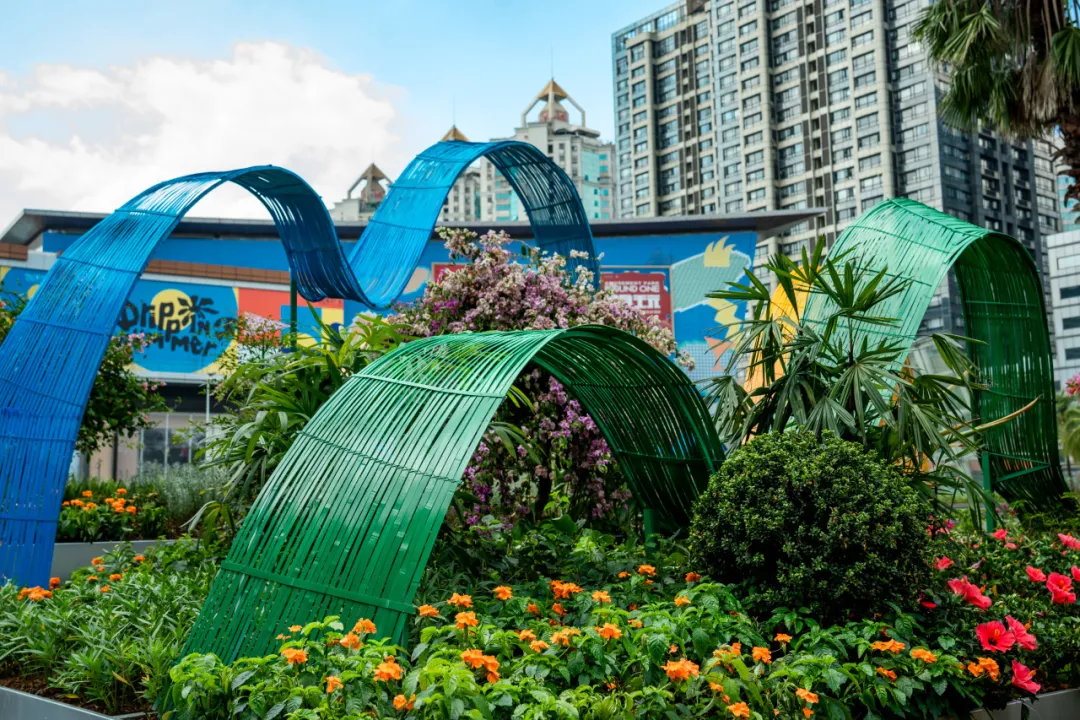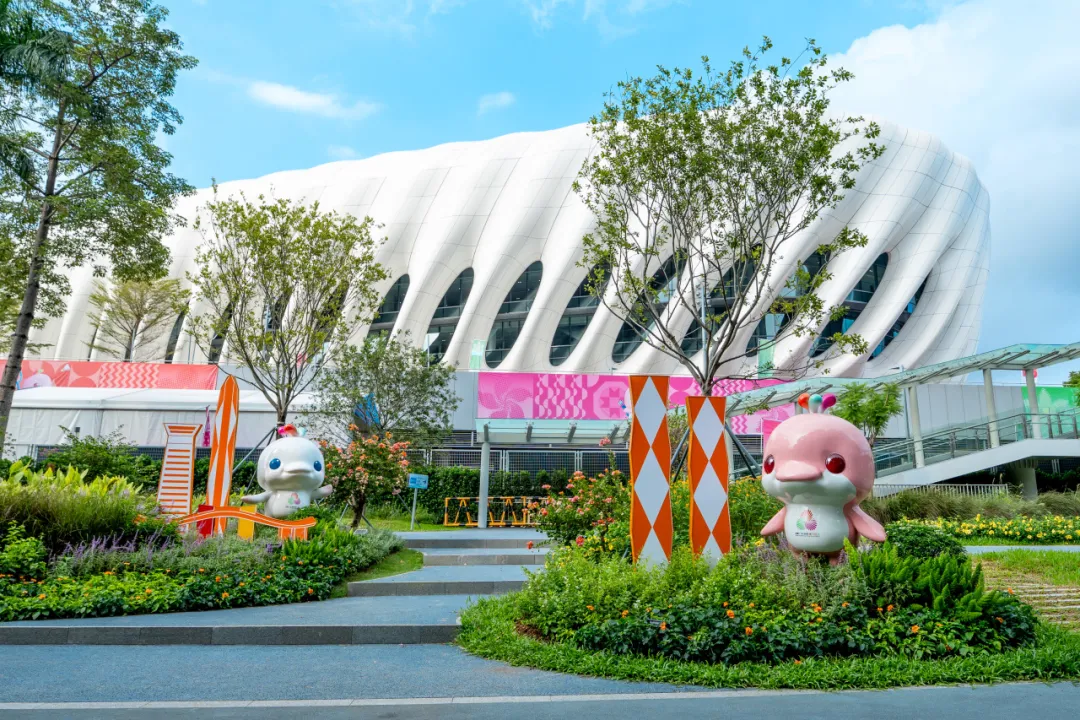 走入市体育中心片区,黄木岗隧道上方,灵动的“飘带”与奔涌的“海浪”竹编装置,将体育的韵律与深圳的海洋基因完美融合。场馆各出入口,赛事吉祥物与长效花境组成生动有趣的迎宾团。