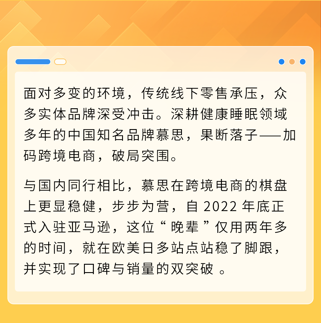 未来,慕思将在持续深耕产品力的基础上,加大创新投入,布局AI智能睡眠等前沿领域,推动产品向智能化。相信凭借专注与创新,慕思定能在跨境市场开辟出更广阔的天地。也期待更多行业领军企业搭乘亚马逊的东风,带着优质产品走向世界,让中国品牌在全球市场大放异彩!