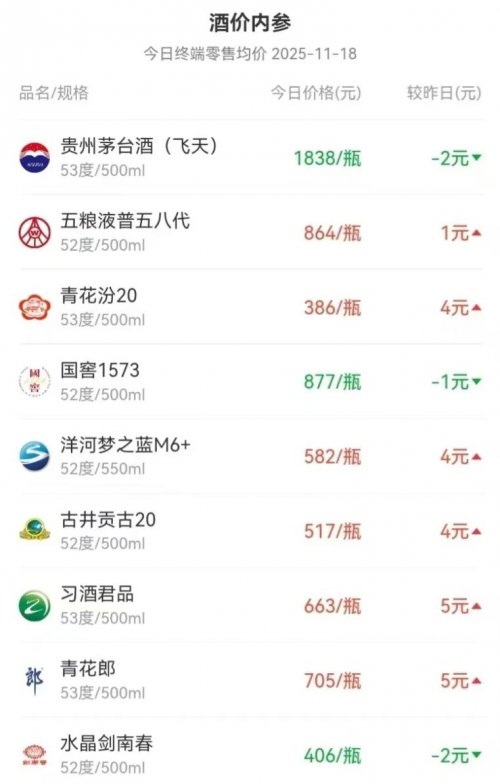 在积极整治措施推动下,线上价格已明显回归正常区间。目前抖音平台飞天茅台报价维持在1750元/瓶以上,作为国内首个终端白酒价格指数,新浪财经“酒价内参”监测显示,11月18日,53度500ml飞天茅台终端价格为1838元/瓶,价格体系呈现稳中走强态势,也从侧面印证了真实消费需求的韧性。