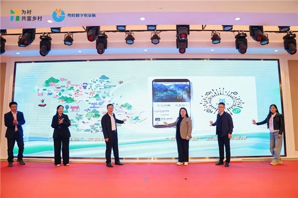 禹明和腾讯SSV为村共富乡村高级项目总监曾艳,为村共富乡村共创基地·村上长漾里联合创始人吴嘉昊,百色市农业农村局副局长杨杰兴,粤桂协作干部代表、乐业县县委常委蔡鹏飞,田阳区内江村乡村CEO代表李婷婷,在大会现场共同发布百色市粤桂数字农文旅地图线路、启动“乐游百色”云服务小程序。