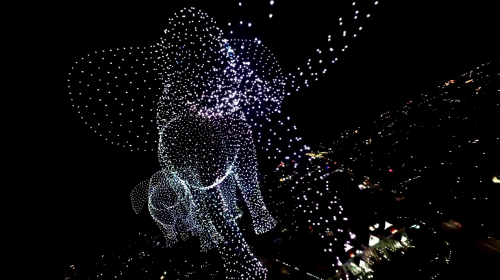 随着夜幕降临,6000架无人机在万象上空精准呈现,依次勾勒出老挝国旗、塔銮寺、大象等具有老挝文化标识的图案,随后变幻出老挝开国元勋凯丰山威汉以及 “50 周年” 庆典标识。空中巨幕在夜色中流转变幻,立体造型与动态场景交织辉映,将中国科技的精准控制与艺术创意完美融合。