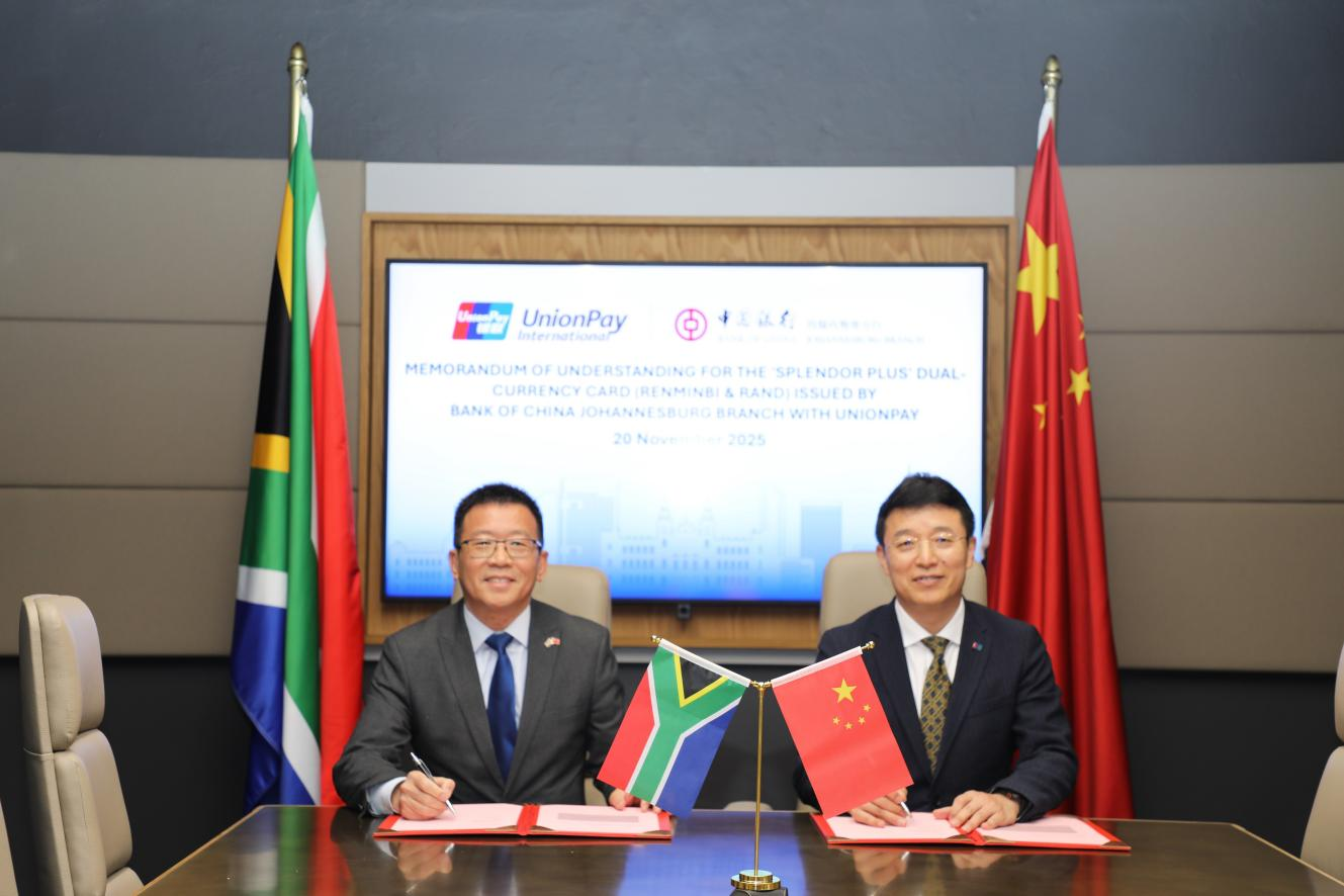 11月20日,银联国际与中国银行约翰内斯堡分行联合宣布,将在南非首次推出银联锦绣中华卡,这也是银联与中行携手在境外第11个国家和地区发行该系列卡片。在中国南非两国央行行长见证下,中国银联董事长兼银联国际董事长董俊峰与中国银行约翰内斯堡分行行长张朝阳签署合作备忘录。