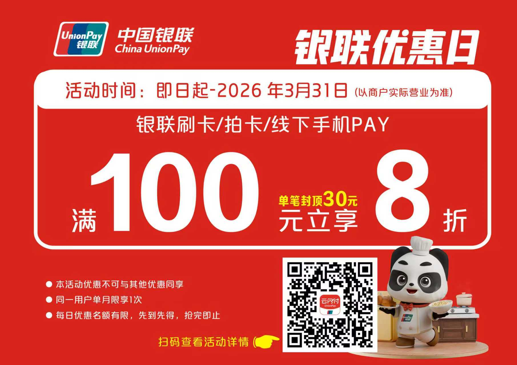 即日起至2026年3月31日,使用银联支付方式,使用指定银联支付方式,即可尊享暖心优惠:满100元享8折,封顶优惠30元。活动适用于手机Pay、银联卡拍卡、刷卡支付。