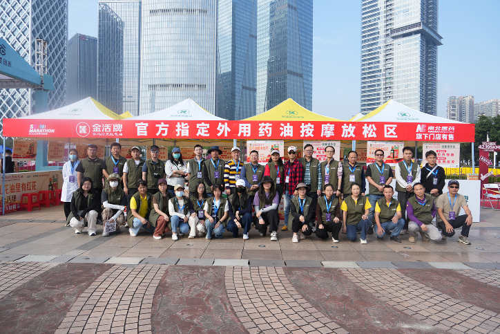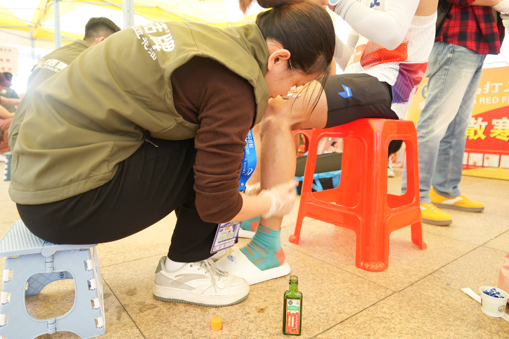 在2025深圳马拉松终点按摩放松区,金活医药 + 南北药行志愿者团队提供金活依马打正红花油按摩拭擦服务。为跑者赛后腿部、肩背等易酸痛部位精准按摩,缓解肌肉疲劳与酸胀感,用贴心拭擦为跑者驱散疲惫。