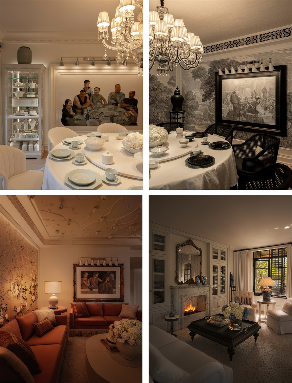 二层包厢以「元初」 「泓影」 「皎岚」 「霓裳」四大主题构筑不同情绪的私宴场景:「元初」融合法式左岸的贵气与东方古董的稳重,以中西器物共融的方式重现17世纪“东方珍宝”进入欧洲的文化脉络;「泓影」以黑白素描语言塑造冷静绅士气质,连通景观最佳露台,使版画风景与真实景致叠合统一;「皎岚」以影青瓷的“月白清影”为基调,为空间带来静谧内敛的雅致气息;「霓裳」专为女性打造,以de Gournay金箔手绘壁纸、粉色丝绒沙发与柔软材质营造松弛优雅的社交氛围,宛如城市中的一间“生活慢室”。搭配THG Paris奢华卫浴及多幅收藏级艺术作品,新荣记在雍熙荣实现了味觉、美学与文化的三重融合,让东方餐叙在当代城市语境中拥有了更具深度的艺术表达。