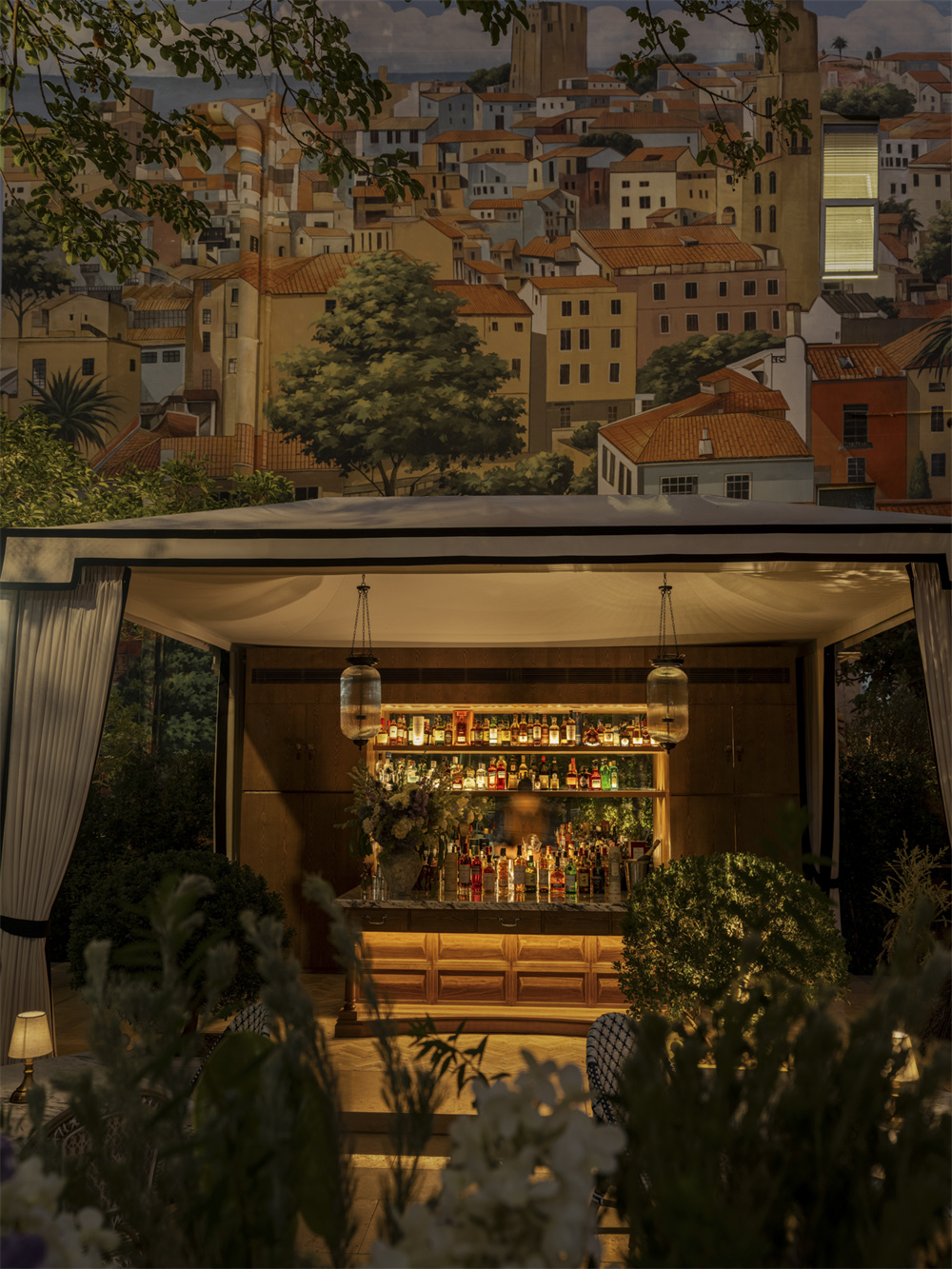 近千平的户外花园以低饱和自然色调铺陈,融合南法庭院布局、欧式花盆与明清石雕,在新旧交织中展现独特文化张力。花园侧翼设独立吧台,以唐人街意象叠加法式庄园氛围,为城市社交注入松弛调性。开阔区域可眺望沙河高尔夫球场,午后光影与傍晚微风自成景致。花园亦预留三处高尔夫打位,让来宾在私域空间中即可体验挥杆的仪式感与从容。