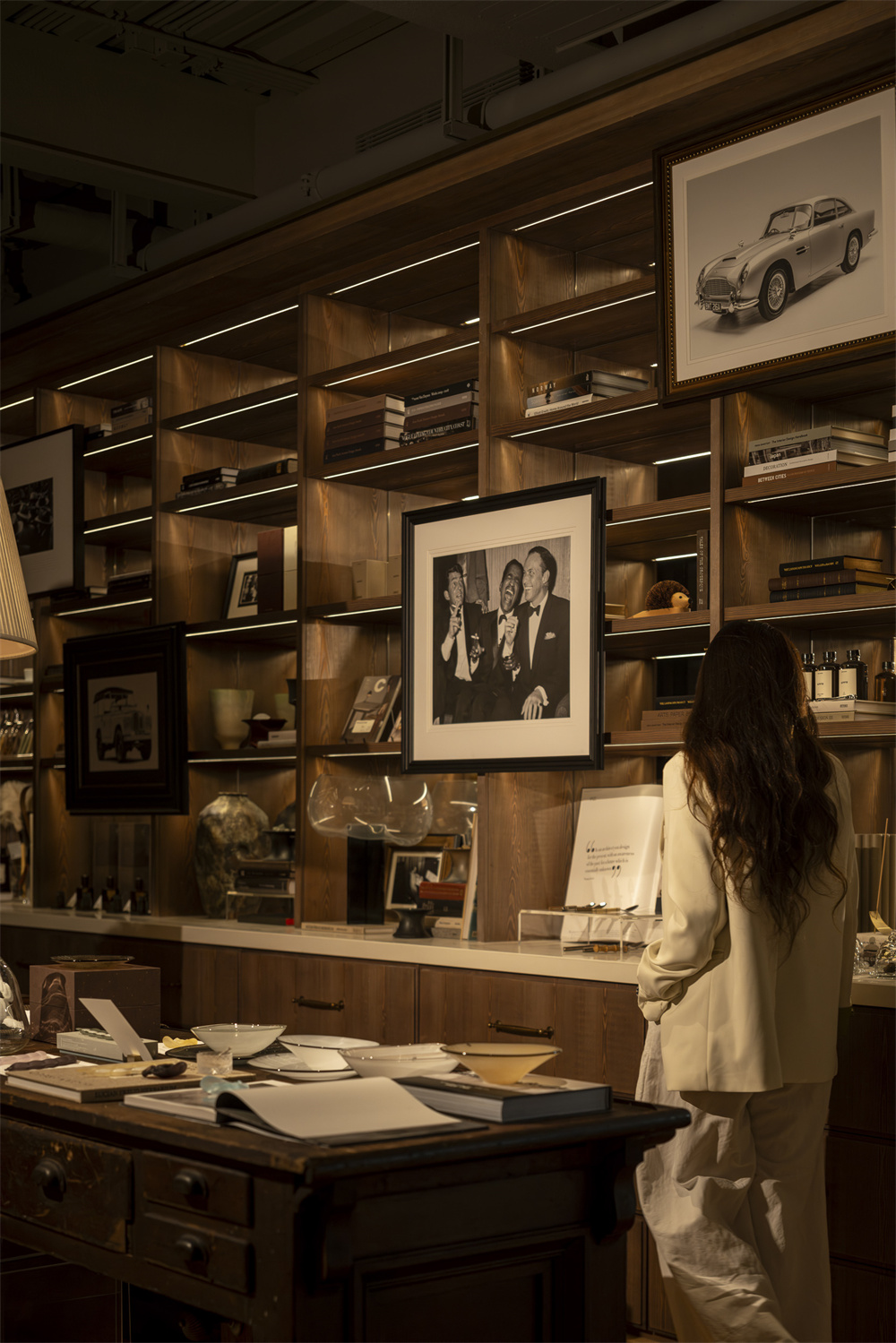 咖啡区右侧的买手店区域以深木色、黑金属与玻璃橱柜构成“策展式零售”结构,将诸如Ralph Lauren Home、Amalgam Collection、Fortnum & Mason、Cire Trudon、CULTI MILANO与APFR等国际高端品牌汇集一处,共同构成雍熙荣独有的审美坐标,形成关于设计、收藏与生活方式的跨界对话。