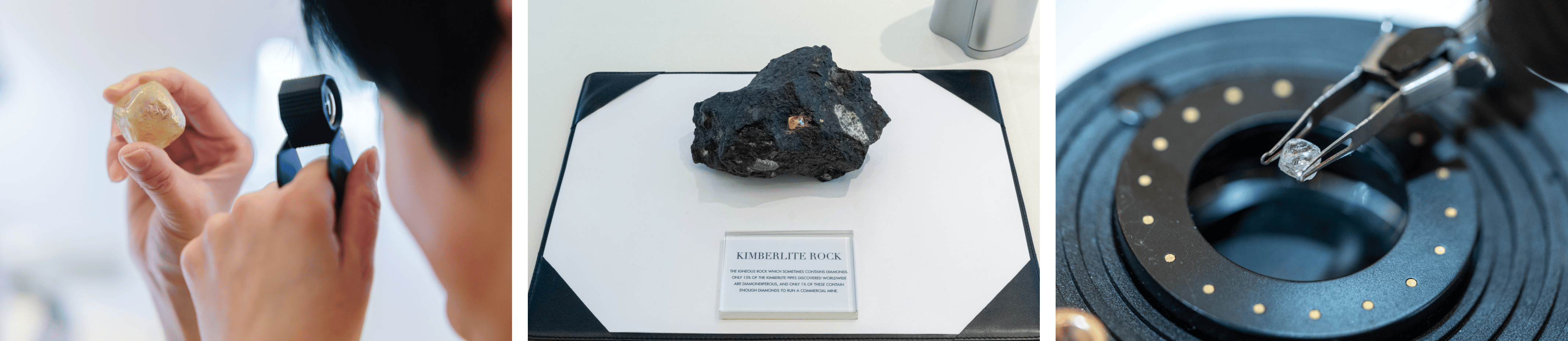 嘉宾鉴赏戴比尔斯集团天然钻石工坊展出的重约297克拉天然钻石原石;于工坊展出的嵌于金伯利岩石的22克拉天然钻石原石及戴比尔斯集团珍罕原石“跳动的心”(Beating Heart)