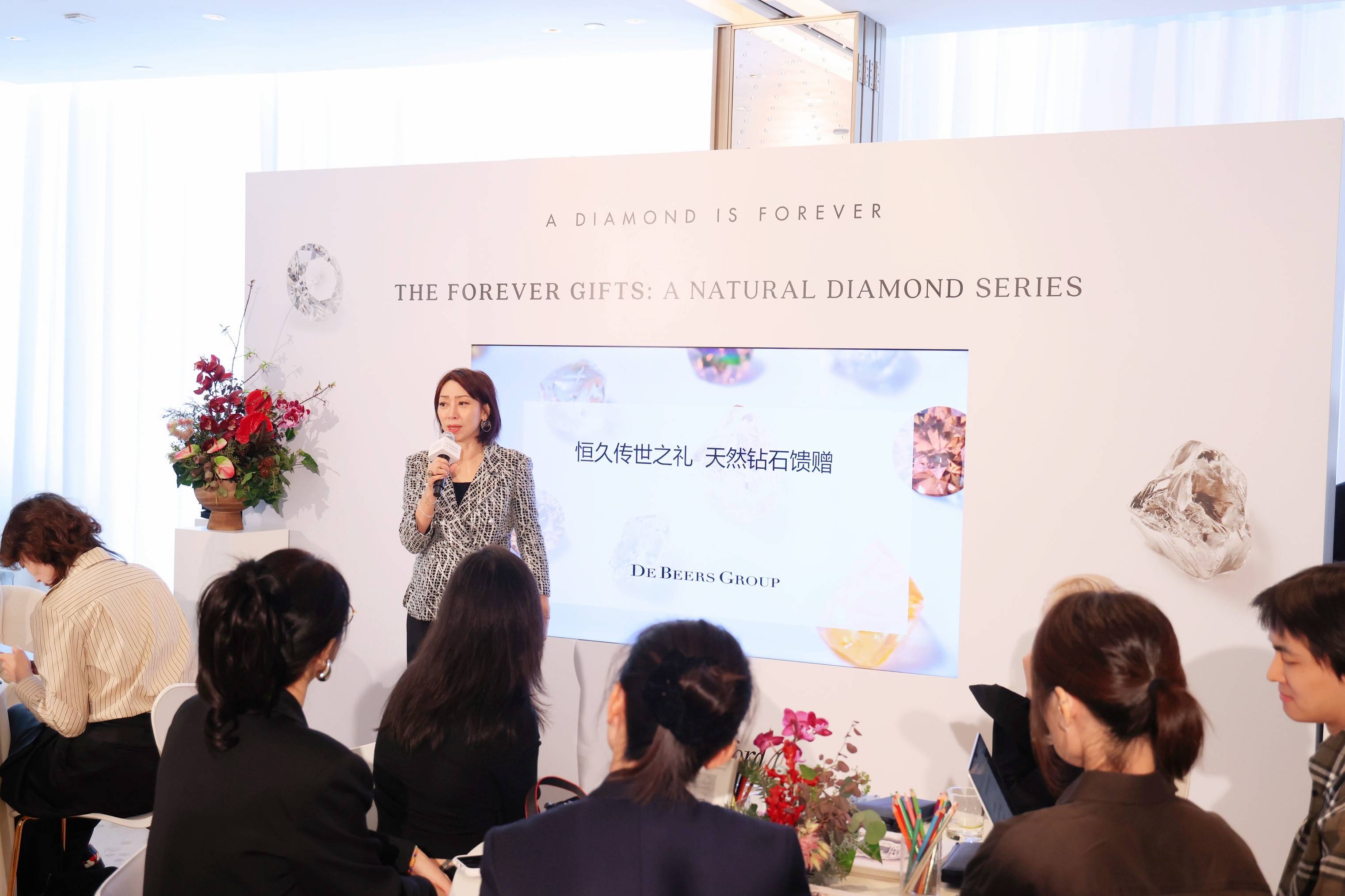戴比尔斯集团天然钻石亚太区市场副总裁黎翠华(Loletta Lai)致辞,邀请来宾开启一段与天然钻石的专属旅程