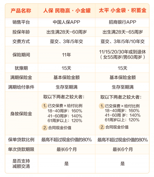 为了搞清楚这类产品是不是“智商税”,我们特意挑选了市面上两款热门产品——人保“小金罐”与太平“小金袋”。它们一个主打中期确定,一个主打长期规划,恰好代表了两全险的两种不同解法。