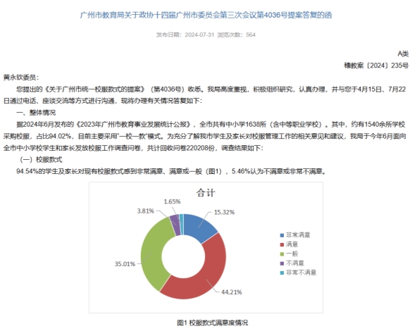 2024年7月,市教育局更以覆盖22万学生及家长的调研数据为支撑,在政协提案答复中表态“暂不推行全市统一校服”——数据显示,94.54%的受访者对现有校服款式满意或接受,92%认可质量,70.14%认为价格合理,高满意度印证了“一校一款”的合理性。