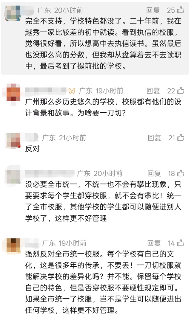 反对方的声音则更加强烈,反对家长强调“校服是校园文化的载体”。广州作为拥有众多百年名校的城市,执信中学、广雅中学、真光中学等校的校服历经数十年传承,已成为校友情感认同的纽带。“我小时候看到执信校服就立志考进去,它是一种精神符号。”一位家长在评论区写道,担心统一后“千校一服”,割裂学校的历史文脉。