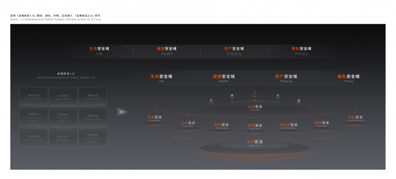 作为行业安全技术的先行者与引领者,吉利在“全域AI”技术体系的赋能下,以“AI为纲 责任为本”,基于原有的“全域安全”技术体系进阶打造“全域安全2.0”技术体系。结合智能时代的安全新需求和新挑战,“全域安全2.0”技术体系秉持“以人为尊”理念,通过技术升级、能力突破与范式创新,将侧重“整车安全”的视角升级为“人-车-路-云-星”的生态视角,旨在贯穿用户出行全场景、覆盖出行全领域、联动出行全生态;并以“生命零伤亡、健康零危害、财产零损失、隐私零泄露”四大安全愿景为指引,逐步构建的一套为消费者提供全面的安全保障技术体系。